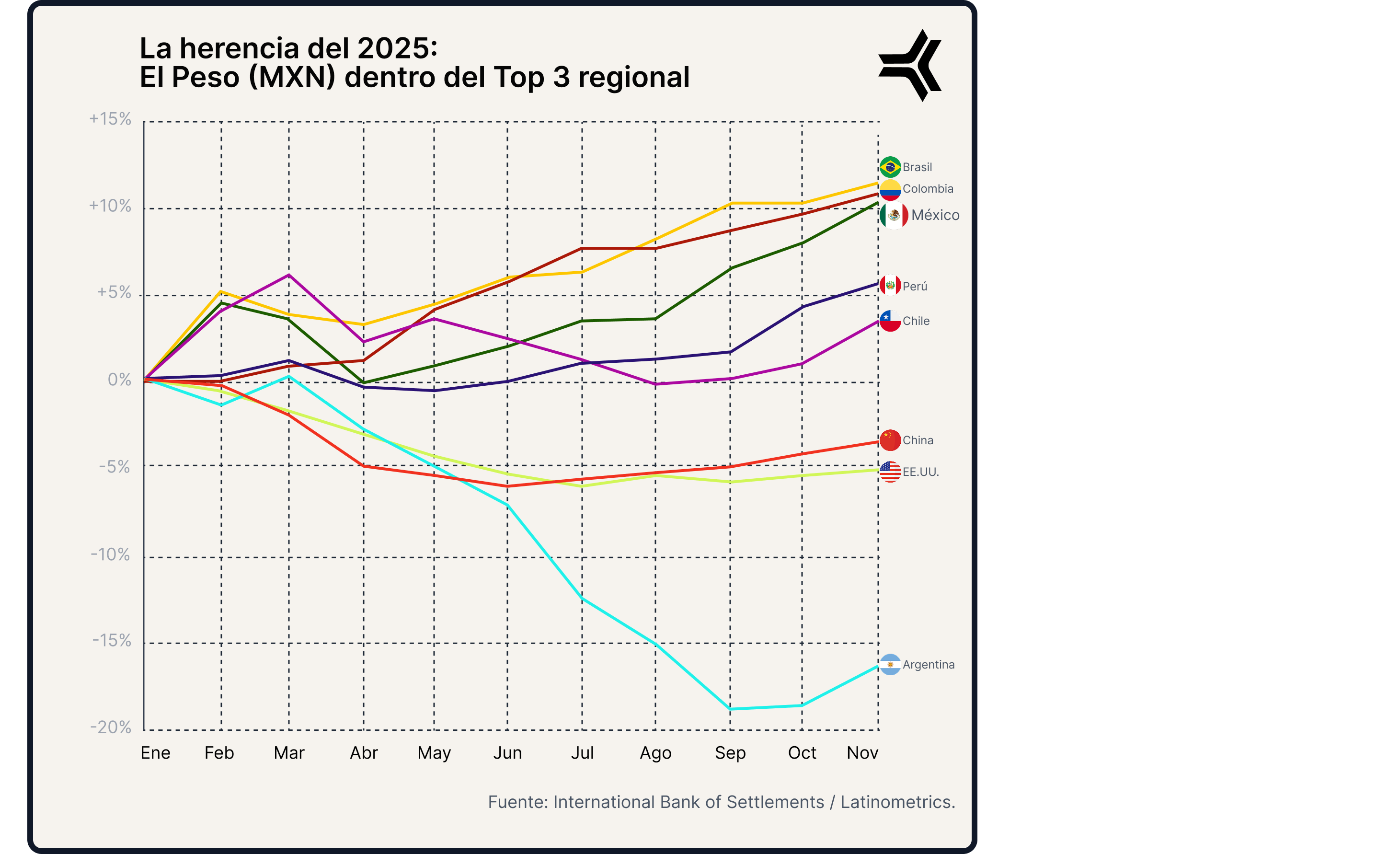 ¿Qué estamos viendo? Al cierre del año pasado, el Peso Mexicano no solo resistió; se consolidó. Mientras el dólar mostraba grietas y otras divisas latinoamericanas se hundían en la volatilidad, el MXN escaló posiciones hasta mantenerse firme en el podio de la región. Esta resiliencia no fue casualidad, sino el resultado de una integración comercial récord y una política monetaria restrictiva que mantuvo el apetito de los inversionistas por los activos mexicanos.
